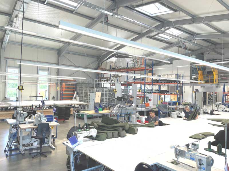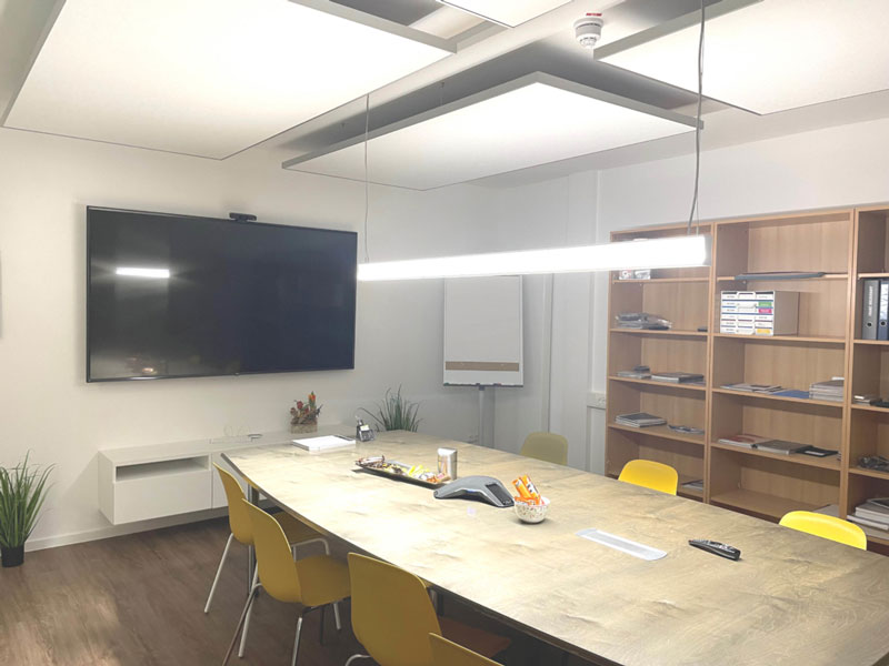 Pour un éclairage optimal des emplois de production, la bande lumineuse 7332 a été utilisée. Les zones des couloirs ont été équipées des luminaires 2840 et 5350. Dans les bureaux et salles de réunion équipés de haute qualité, un éclairage très homogène a été atteint avec les lampes de construction 2090, où les luminaires ont été placés simultanément comme élément de design dans l’espace.